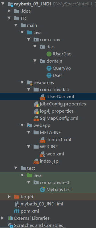 1 2 3 4 5 6 7 8 9 10 11 12 13 14 15 16 17 18 19 20 21 22 23 24 25 26 27 28 29 30 31 32 33 34 35 36 <configuration > <properties resource ="jdbcConfig.properties" /> <typeAliases > <package name ="com.conv.domain" /> </typeAliases > <environments default ="mysql" > <environment id ="mysql" > <transactionManager type ="JDBC" /> <dataSource type ="JNDI" > <property name ="data_source" value ="java:comp/env/jdbc/learn" /> </dataSource > </environment > </environments > <mappers > <package name ="com.conv.dao" /> </mappers > </configuration >